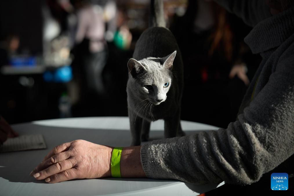 A Russian Blue cat is pictured during an international show of purebred cats in Warsaw, Poland, on Jan. 17, 2026. Around 200 cats of various breeds were showcased at the event organized by Poland's cat fanciers association SMK Jedynka. (Photo by Jaap Arriens/Xinhua)