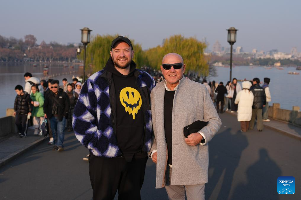Spanish tourist Jose Vicente Guerrero (R, front) and his son Ander Guerrero pose for a photo at West Lake scenic area in Hangzhou, east China's Zhejiang Province, Jan. 3, 2026. (Xinhua/Huang Zongzhi)