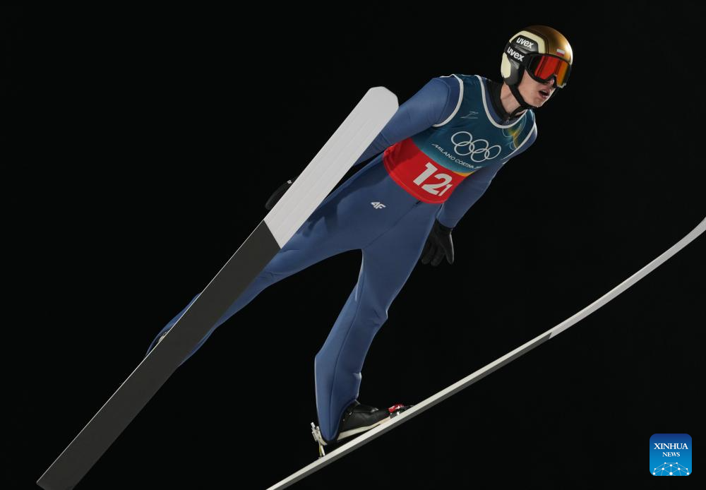 Kacper Tomasiak of Poland competes during the first round of the ski jumping men's super team event at the Milan-Cortina 2026 Olympic Winter Games in Predazzo, Italy, Feb. 16, 2026. (Xinhua/Meng Yongmin)