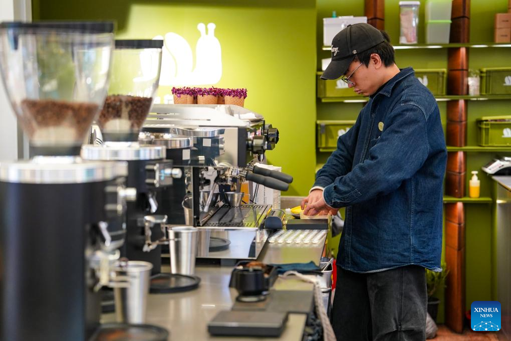 A barista makes coffee at Daguan Zhuanxin farmers' market in Kunming, southwest China's Yunnan Province, Jan. 27, 2026. While preserving the original function of a farmers' market, Daguan Zhuanxin farmers' market has now been upgraded to a complex of cultural experience, dining and entertainment, which offers tourists a window to experience local flavor and vibe. (Xinhua/Chen Xinbo)