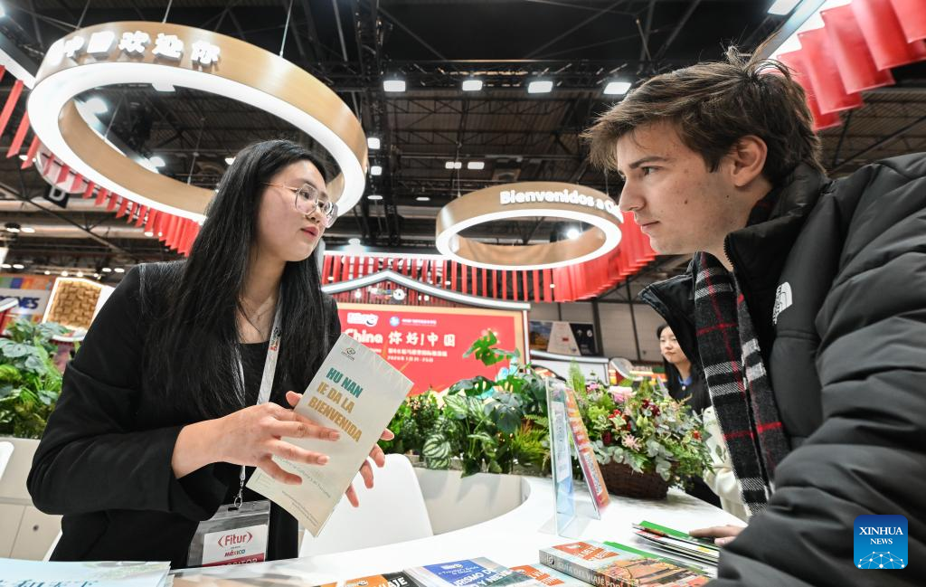 Exhibitors visit the booth of China during the 2026 FITUR international tourism exhibition in Madrid, Spain on Jan. 22, 2026. The booth of China held its opening ceremony at the 2026 FITUR international tourism exhibition in Madrid on Thursday. (Xinhua/Cheng Min)