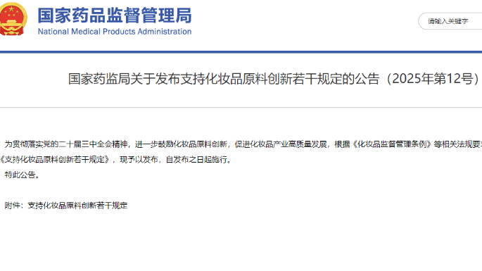 國(guó)家藥監(jiān)局關(guān)于發(fā)布支持化妝品原料創(chuàng)新若干規(guī)定的公告(2025年第12號(hào))