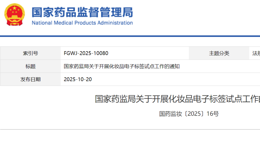 國(guó)家藥監(jiān)局關(guān)于開(kāi)展化妝品電子標(biāo)簽試點(diǎn)工作的通知 國(guó)藥監(jiān)妝〔2025〕16號(hào)