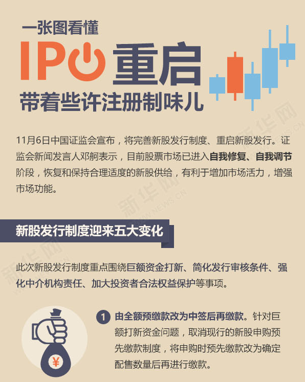 ????新華網(wǎng)北京11月6日電(記者 屈紹輝)6日中國證監(jiān)會宣布,將完善新股發(fā)行制度重啟新股發(fā)行。證監(jiān)會相關(guān)負(fù)責(zé)人表示,此次改革重點(diǎn)圍繞解決巨額資金打新、簡化發(fā)行審核條件、強(qiáng)化中介機(jī)構(gòu)責(zé)任、加大投資者合法權(quán)益保護(hù)等事項,這是新股發(fā)行體制改革的進(jìn)一步深化,朝著股票注冊制改革的方向又邁出了堅實的一步。