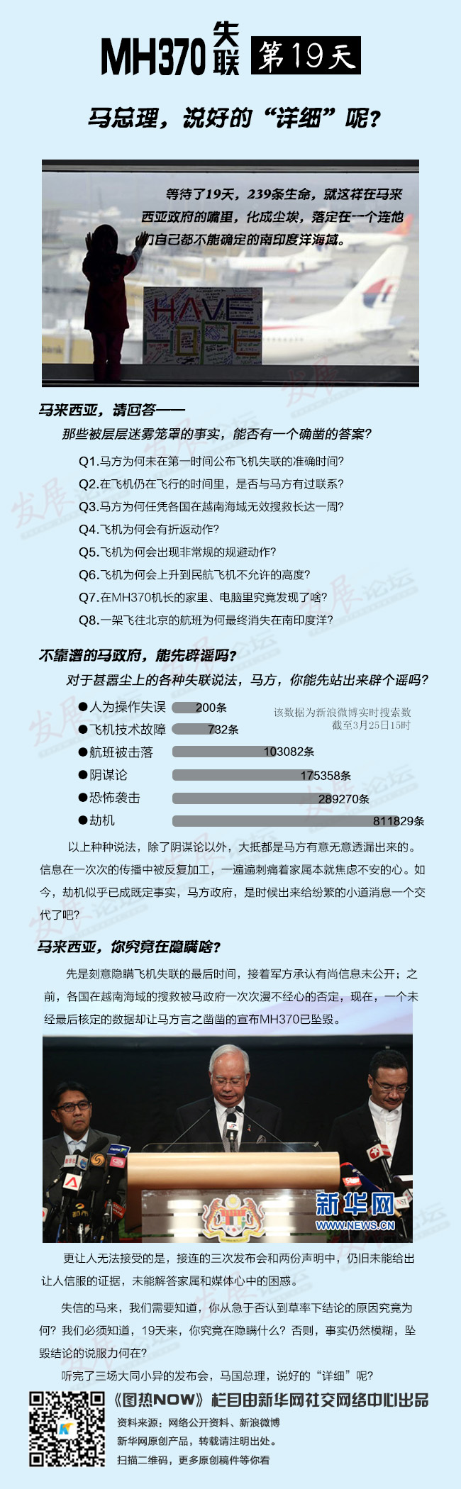 等待了19天,239條生命,就這樣在馬來(lái)西亞政府的嘴里,化成塵埃,落定在一個(gè)連他們自己都不能確定的南印度洋海域。事實(shí)仍然模糊,結(jié)論的說(shuō)服力何在?馬國(guó)總理,你說(shuō)好的“詳細(xì)”呢?