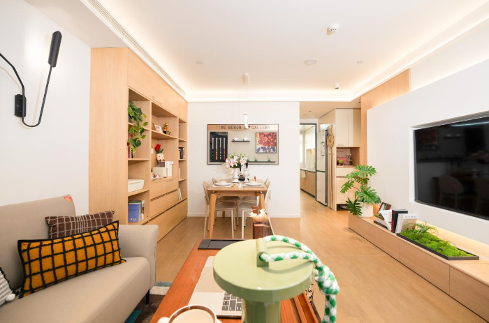 作为展厅2.0理念的核心,天津圣都整装全新亮相的产品化样板房以“真户型、真需求、真落地”为内核,依托贝壳楼盘字典的真实数据,天津圣都整装选取60㎡、76㎡、89㎡和110㎡四种典型户型,打造了“百变魔方”“自然生活”“都市艺术”“津门海派”4大产品化样板房,1:1 还原了两居、三居、老小区等天津本地热门真实户型。圣都整装天津大区产品研发中心徐世友以76平方米的“自然生活”户型为例,重点介绍了天津圣都整装如何针对老旧小区收纳不足、功能单一等问题,通过极致化收纳和多功能场景设计,让小空间实现大功能。