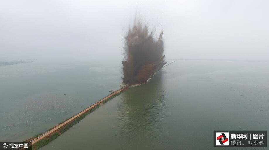 ??? 7月14日7時(shí),伴隨著一聲聲的爆破轟鳴,梁子湖與牛山湖隔堤正式實(shí)施爆破作業(yè),這標(biāo)志著湖北梁子湖流域的牛山湖正式破垸分洪。(圖片來源:視覺中國)