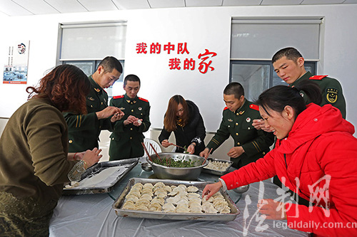 ????2017年1月22日,江蘇連云港邊檢站官兵與駐地百姓歡聚一堂,一起包餃子、做湯圓,閑話家常,其樂融融,把弄弄的軍民魚水情都包進(jìn)了餃子里。(鄭永波 錢逸帆)