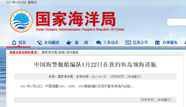 新華網(wǎng)北京2月18日電 據(jù)國家海洋局網(wǎng)站報(bào)道,2017年2月18日,中國海警2401、2337、2101、2106艦船編隊(duì)在我釣魚島領(lǐng)海內(nèi)巡航。