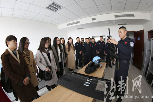 ????上午9時,一輛掛著“相約藍盔、愛在警營”紅色橫幅的大巴車緩緩駛入警隊營區(qū)。一下車,姑娘們饒有興致地參觀了警隊內務設置和裝備展示,現場觀看了藍盔方陣扣人心弦的戰(zhàn)術表演,隊員們氣吞萬里的練兵激情、敢打必勝的過硬素質,一下子吸引了大家的眼光。在此之前,她們只是在心中默默仰慕那頂“藍色貝雷帽”,從電視上看到過威武帥氣的維和隊員。第一次如此近距離接觸,讓不少姑娘的心中蕩起層層漣漪。