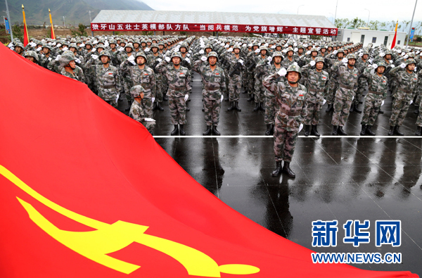 2015年勝利日大閱兵訓(xùn)練期間,“狼牙山五壯士”英模部隊(duì)方隊(duì)組織宣誓活動(dòng)(2015年6月29日攝)。新華社發(fā)