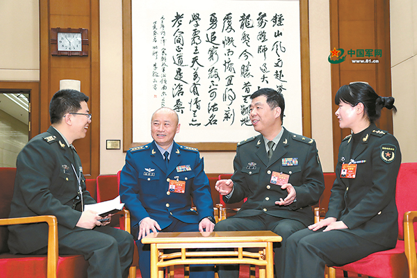 ????3月10日,解放軍報記者張軍勝(左一)采訪軍隊人大代表王獻(xiàn)軍、楊征、潘佳瑛(左二至左四)。解放軍報記者 穆可雙 攝