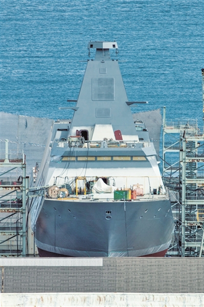 ????先進(jìn)雷達(dá)技術(shù)方面,30FFM采用先進(jìn)的封閉式綜合射頻桅桿,具有結(jié)構(gòu)強(qiáng)度高、雷達(dá)散射截面積小、電子設(shè)備集成性好等優(yōu)點(diǎn)。該艦首次將相控陣?yán)走_(dá)陣列集成在桅桿上,同時(shí)還布置了4面OPY-2型X波段多功能相控陣?yán)走_(dá),執(zhí)行對空、對海搜索任務(wù)。下方小尺寸天線陣列是NOLQ-3E電子戰(zhàn)系統(tǒng)。此外,桅桿上還集成了OAX-3光電傳感器,但未安裝雙波段雷達(dá),因此探測距離和精度不足。
