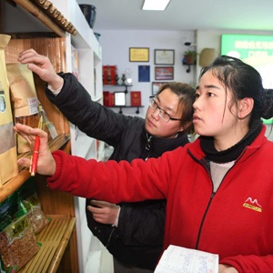 張志菊(前)在自己的土特產(chǎn)店里清點(diǎn)商品(2月26日攝)。
