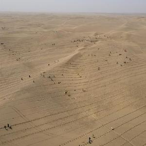 3月28日,人們?cè)谇夷┛h城不遠(yuǎn)處的塔克拉瑪干沙漠內(nèi)植樹(shù)(無(wú)人機(jī)照片)。