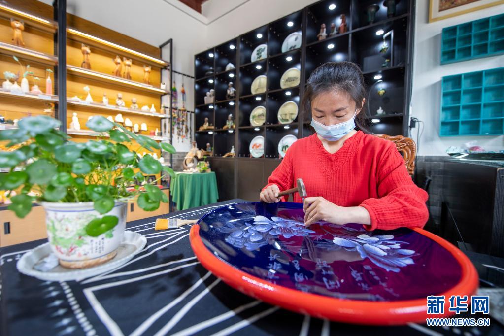5月4日,山西省級(jí)非遺傳統(tǒng)刻瓷項(xiàng)目傳承人苗振潔在太原古縣城內(nèi)刻瓷。