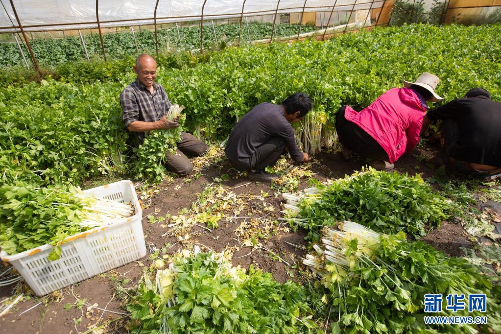 8月13日,在四川省阿壩藏族羌族自治州紅原縣邛溪鎮(zhèn)熱坤村的蔬菜大棚,種植戶(hù)在收割芹菜。