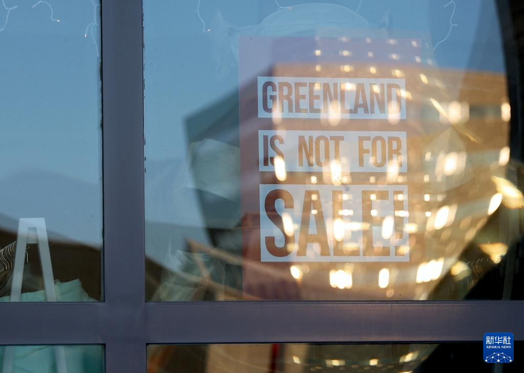 2月8日,在丹麦自治领地格陵兰岛首府努克,一家商铺橱窗上贴着“格陵兰岛不出售”标语。