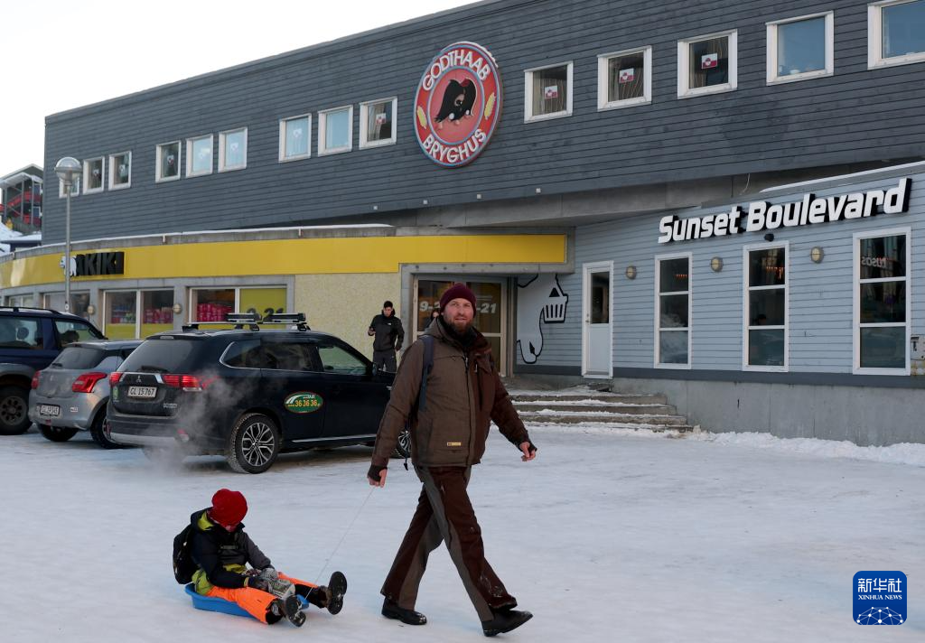 2月8日,在丹麦自治领地格陵兰岛首府努克,一名儿童坐在简易雪橇中,由大人牵引着前往超市购物。