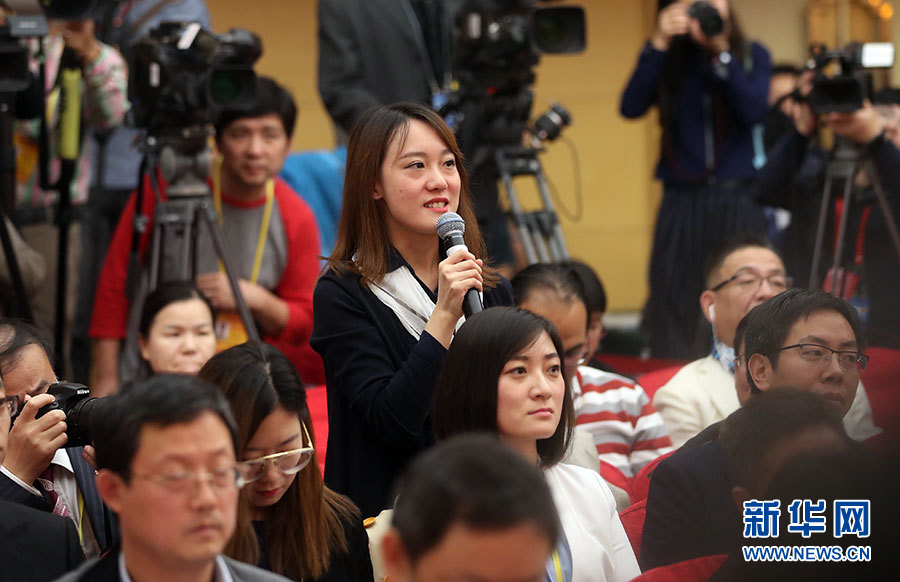 10月21日,十九大新聞中心舉辦記者招待會,邀請中共中央統(tǒng)戰(zhàn)部常務(wù)副部長張裔炯、副部長冉萬祥,中共中央對外聯(lián)絡(luò)部副部長郭業(yè)洲介紹黨的統(tǒng)一戰(zhàn)線工作和黨的對外交往情況,并回答記者提問。圖為經(jīng)濟(jì)日報記者提問。新華網(wǎng) 郝廣鵬攝
