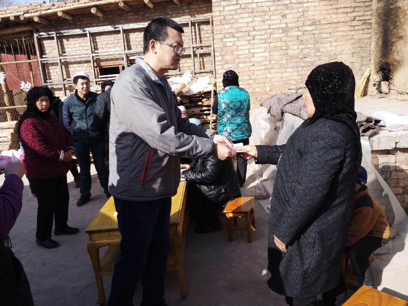 包毅為貧困戶發(fā)放慰問金,宣傳精準扶貧政策