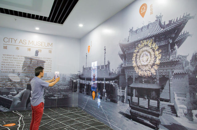 8月1日,呼和浩特玉泉區(qū)大數(shù)據(jù)應(yīng)用產(chǎn)業(yè)基地的工作人員通過平板設(shè)備展示城市博物館AR體驗墻。新華社發(fā) 丁根厚 攝