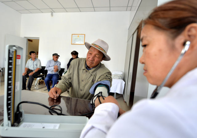 7月5日,60歲的牧民哈斯朝魯在阿巴嘎旗“哈樂穆吉”養(yǎng)老中心測量血壓。新華社記者 任軍川 攝
