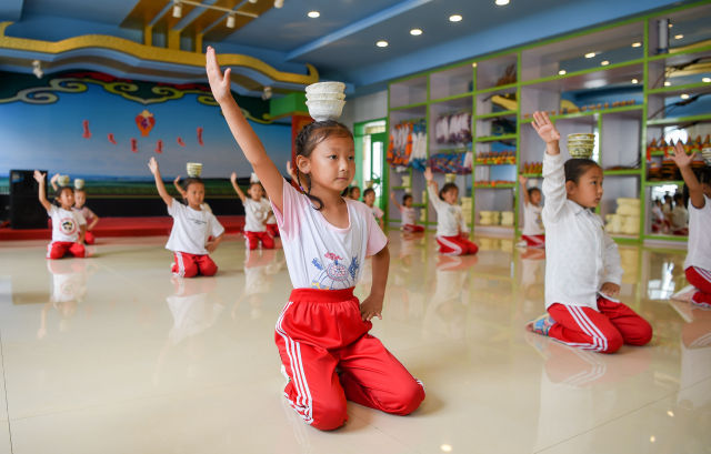 7月4日,達爾罕茂明安聯(lián)合旗蒙古族幼兒園的孩子正在練習(xí)蒙古族特色舞蹈。新華社記者 連振 攝