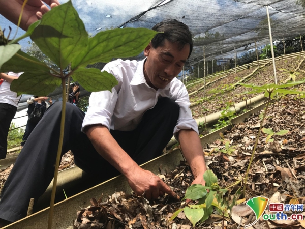 肯乃在重樓種植地向記者介紹種植情況。中國青年網(wǎng)記者 張瑞宇攝