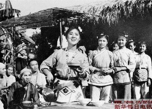 影片《劉三姐》中的一個(gè)鏡頭:劉三姐(前,黃婉秋飾)和四方歌手會歌。新華社資料片