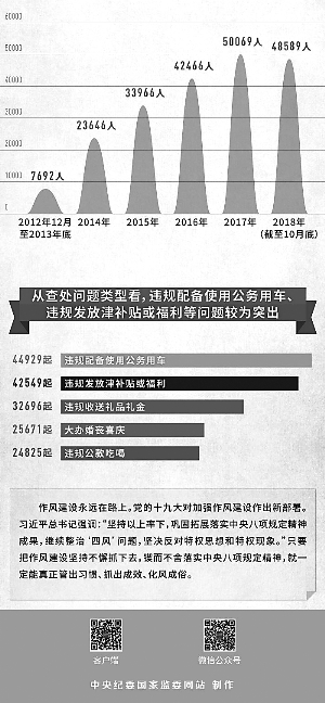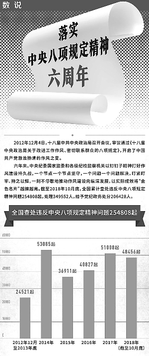 六年來,中央紀(jì)委國(guó)家監(jiān)委和各級(jí)紀(jì)檢監(jiān)察機(jī)關(guān)以釘釘子精神打好作風(fēng)建設(shè)持久戰(zhàn),一個(gè)節(jié)點(diǎn)一個(gè)節(jié)點(diǎn)堅(jiān)守,一個(gè)問題一個(gè)問題解決,盯緊盯牢、持之以恒,一刻不停歇地推動(dòng)作風(fēng)建設(shè)向縱深發(fā)展,以實(shí)際成效將“金色名片”越擦越亮。截至2018年10月底,全國(guó)累計(jì)查處違反中央八項(xiàng)規(guī)定精神問題254808起,處理349552人,給予黨紀(jì)政務(wù)處分206428人。