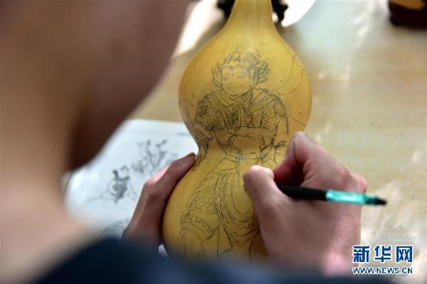 午后陽(yáng)光和煦,聽障生創(chuàng)新創(chuàng)業(yè)工作室里,來(lái)自貴州的徐崇瑞手持鉛筆,在一個(gè)嶄新的葫蘆上勾勒年畫,筆法細(xì)膩,有條不紊。身后的書架上整齊擺放著他們制作的葫蘆烙畫、手工皮包、糧食鑲嵌畫等作品。