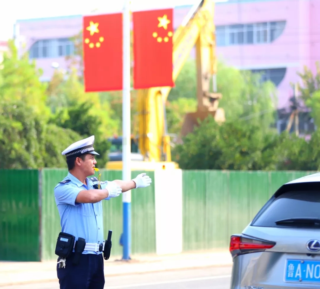 2019年9月30日,山東濟(jì)陽。國旗下,交通警察在指揮車輛行駛。作者:墨影耕耘——劉子平