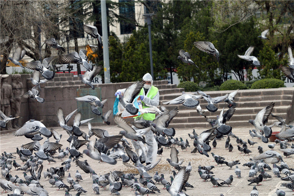 4月11日,土耳其首都、第二大城市安卡拉首度實(shí)施周末“居家令”時,政府工作人員給鴿子喂食 。新華社發(fā)(穆斯塔法·卡亞攝)
