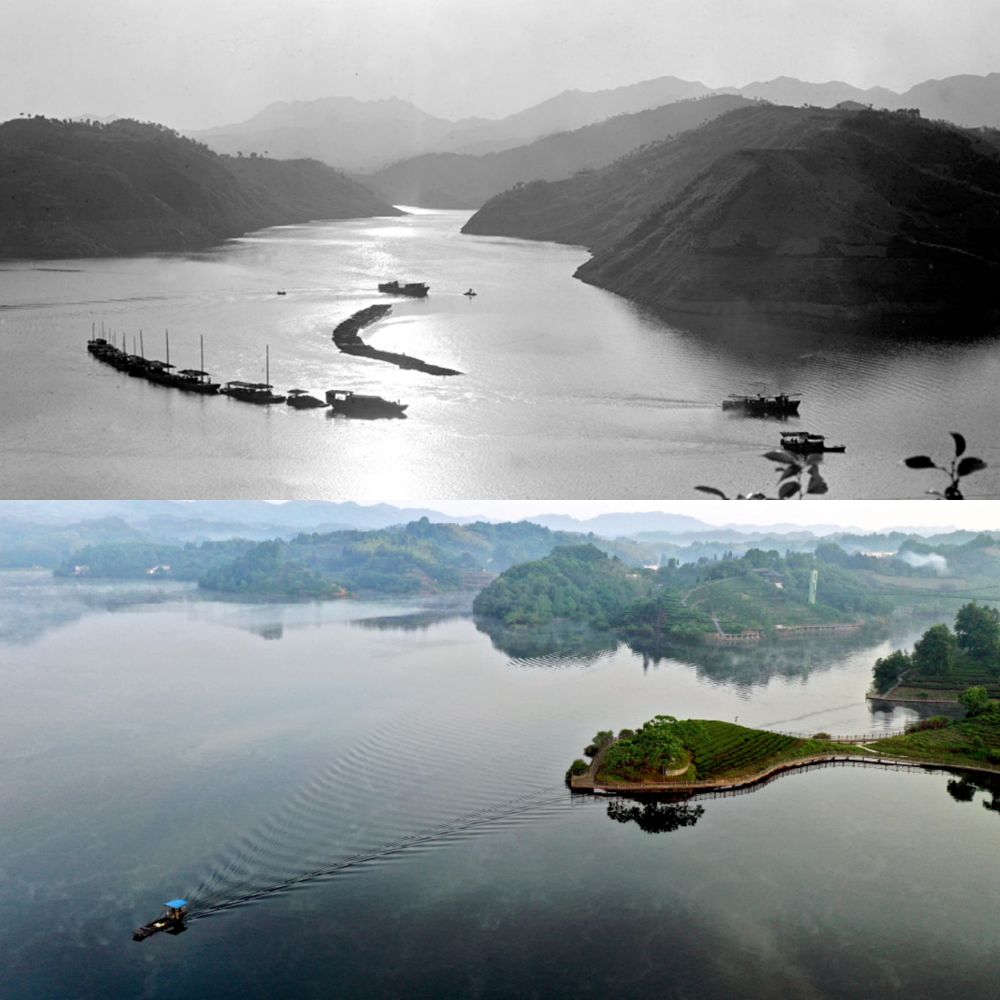 ?。ㄉ蠄D:1976年金寨的水庫,新華社記者成大林攝;下圖:2019年水庫之上是茶谷。新華社記者陶明攝)