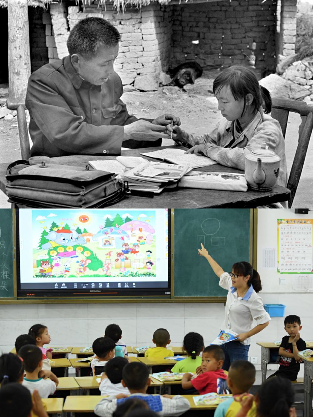 ?。ㄉ蠄D:1991年5月,金寨縣希望小學老師胡遵訓跑20多里山路為學生胡亞麗補課,新華社記者張曙光攝;下圖:2019年9月3日,金寨縣希望小學南校區(qū)學生通過多媒體上課。新華社記者劉軍喜攝)