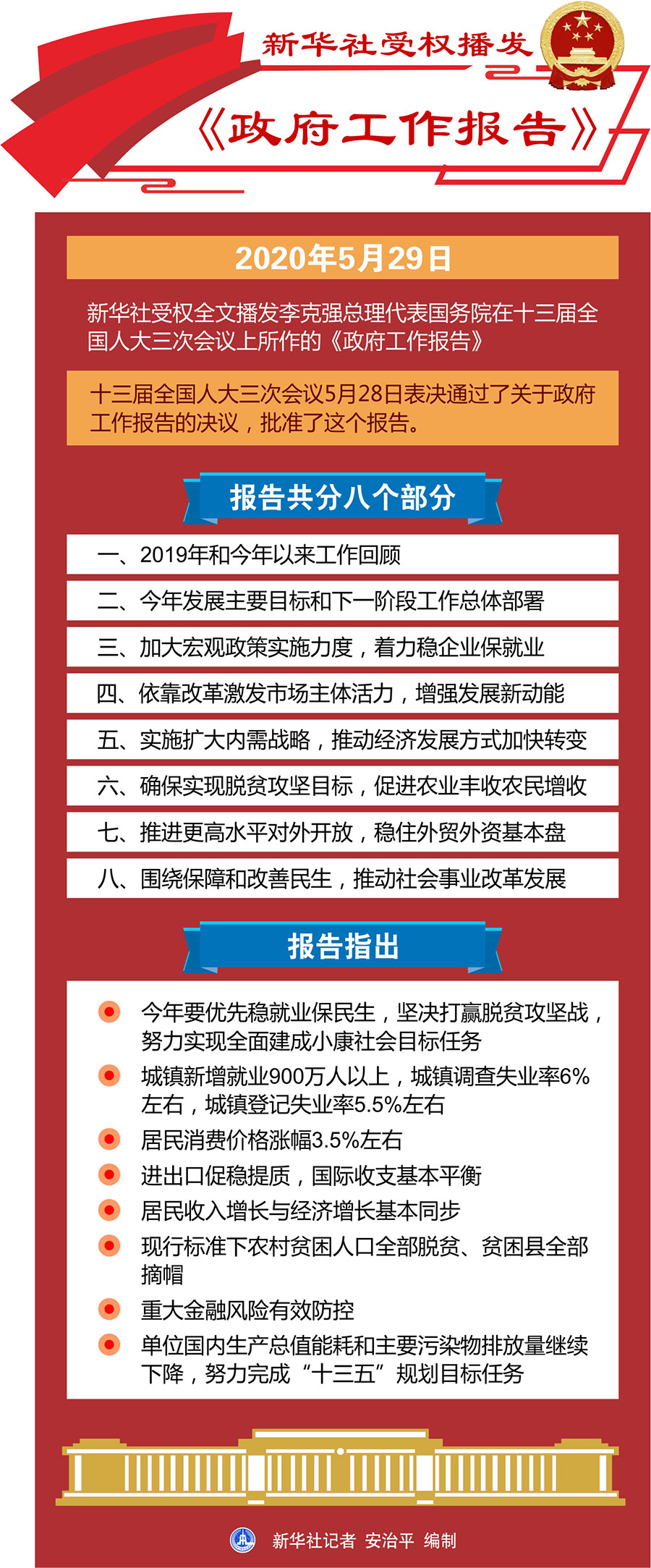 新華社北京5月29日電 新華社受權(quán)于29日全文播發(fā)李克強(qiáng)總理代表國務(wù)院在十三屆全國人大三次會議上所作的《政府工作報告》。十三屆全國人大三次會議5月28日表決通過了關(guān)于政府工作報告的決議,批準(zhǔn)了這個報告。