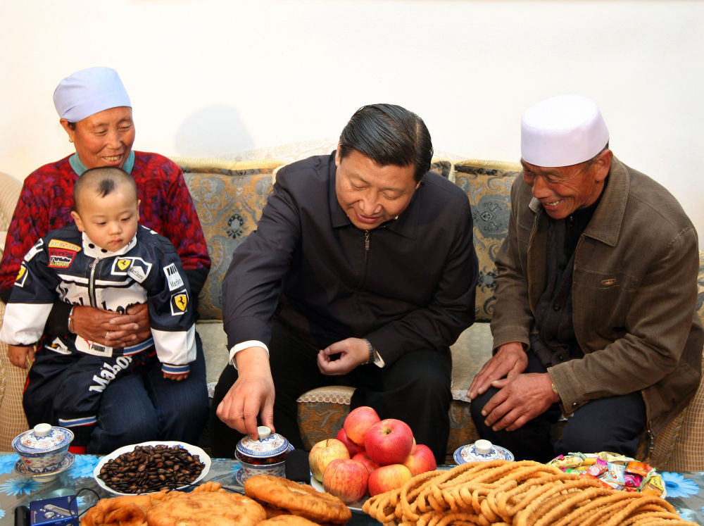 (2008年4月8日,習(xí)近平在固原市原州區(qū)開(kāi)城鎮(zhèn)深溝村考察新農(nóng)村建設(shè)情況時(shí)看望回族農(nóng)民金學(xué)文一家,并在農(nóng)民家品嘗當(dāng)?shù)氐纳w碗茶。新華社記者蘭紅光攝)