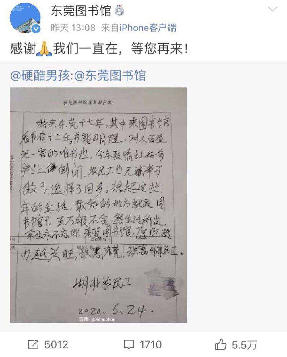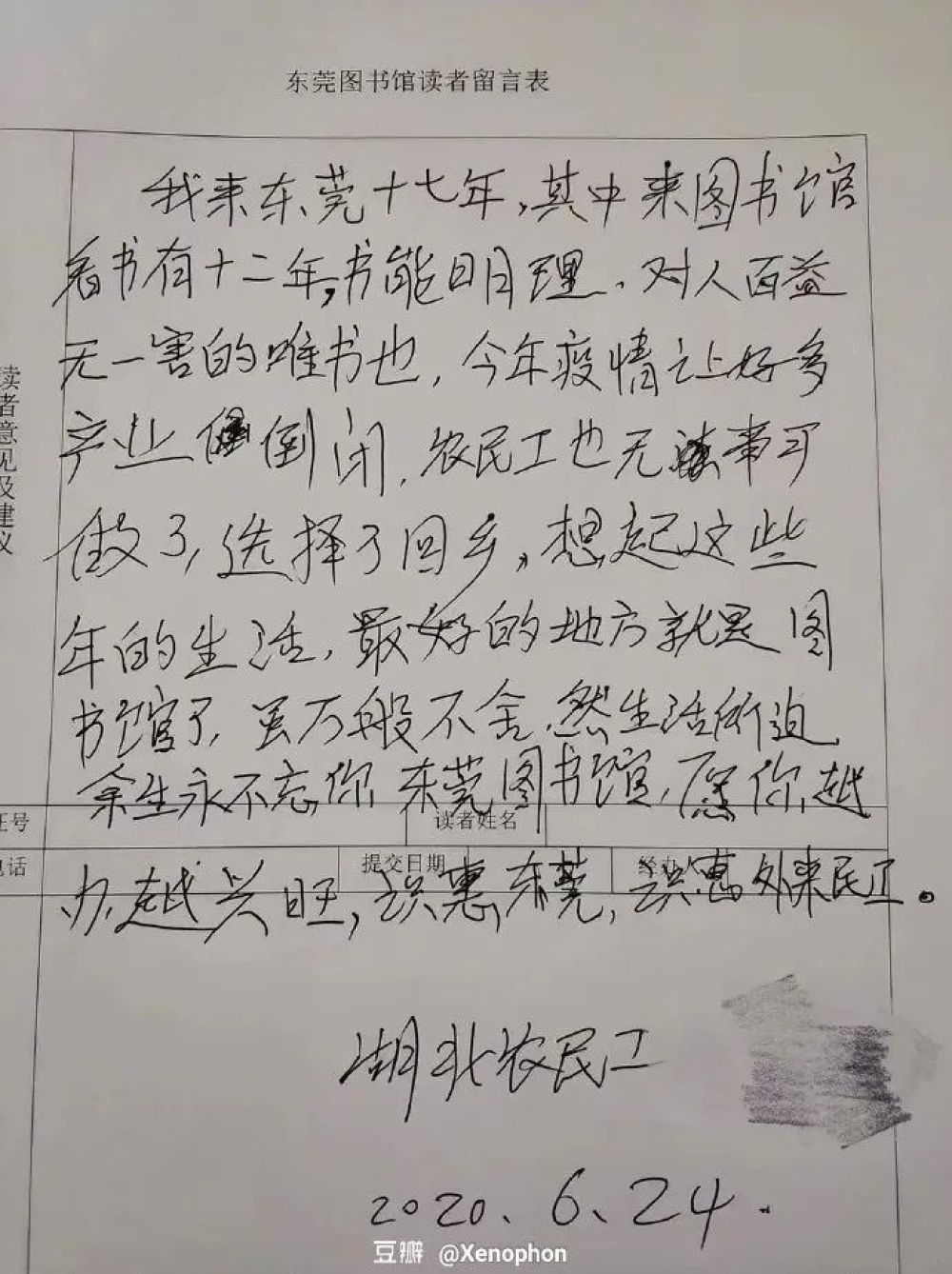 “我來(lái)東莞十七年,其中來(lái)圖書館看書有十二年。書能明理,對(duì)人百益無(wú)一害的唯書也。今年疫情讓好多產(chǎn)業(yè)(企業(yè))倒閉,農(nóng)民工也無(wú)事可做了,選擇了回鄉(xiāng)。想起這些年的生活,最好的地方就是圖書館了。雖萬(wàn)般不舍,然生活所迫,余生永不忘你,東莞圖書館,愿你越辦越興旺。識(shí)惠東莞,識(shí)惠外來(lái)農(nóng)民工。”