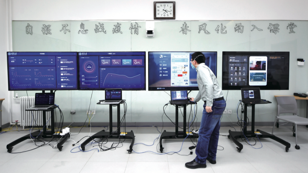 2月17日,工作人員在管理維護(hù)清華大學(xué)在線教學(xué)平臺(tái) “雨課堂”(鞠煥宗/攝)