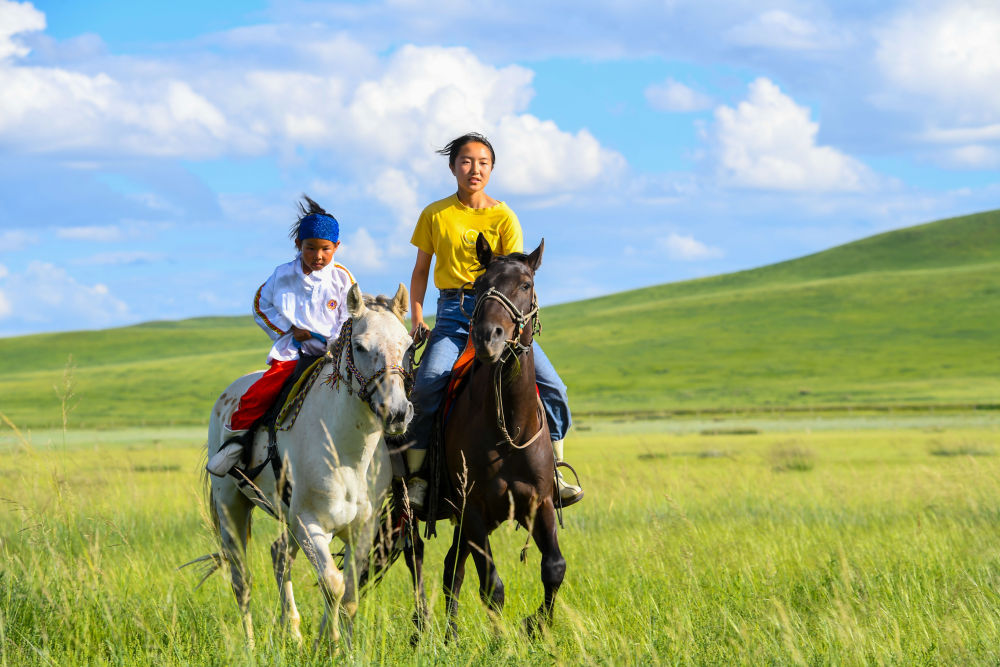 8月4日,錫林花(右)和小伙伴烏日嘎(左)在草原上騎馬。