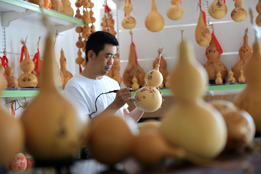 ????河北省邢臺(tái)市平鄉(xiāng)縣霍建龍,2014年因一起意外事故導(dǎo)致高位截癱。身殘志堅(jiān)的他學(xué)習(xí)烙畫葫蘆藝術(shù),實(shí)現(xiàn)脫貧致富,并創(chuàng)辦了殘疾人烙畫葫蘆社,帶領(lǐng)其他殘疾貧困群眾脫貧致富。圖為霍建龍整理葫蘆作品。 柴更利 攝