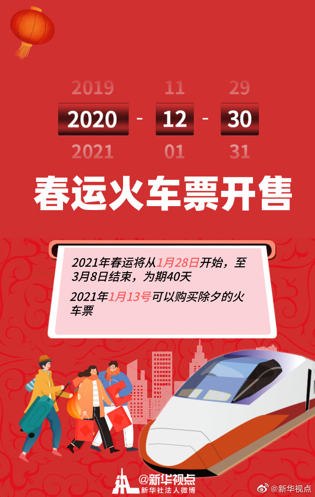 12月30日,2021年春運(yùn)火車票正式開始發(fā)售。2021年春運(yùn)將從1月28日開始,至3月8日結(jié)束,為期40天。不知道你做好出行計(jì)劃了嗎?說(shuō)到買票,讓小編為你敲重點(diǎn):1月13日前后可以購(gòu)買除夕前后的火車票;想安安靜靜旅行,你可以選擇靜音車廂;票沒搶到,你可以通過(guò)“候補(bǔ)購(gòu)票”功能試試運(yùn)氣??紤]疫情原因,建議有條件的旅客錯(cuò)峰出行,避開春運(yùn)高峰期,出行時(shí)做好防護(hù)措施,全程佩戴口罩。(記者 樊曦 周圓)