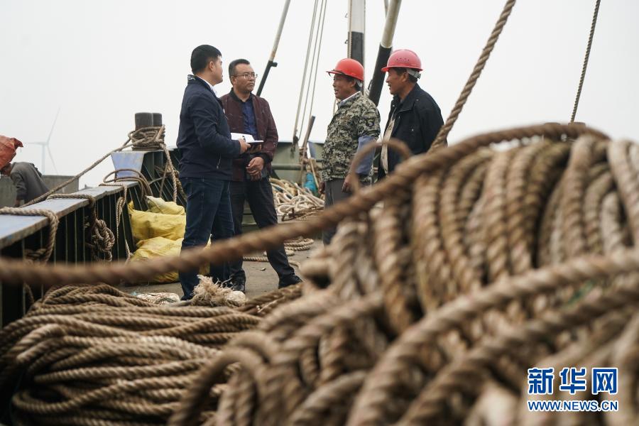 2020年10月21日,江蘇省海安市濱海新區(qū)紀(jì)工委干部(左一、左二)向漁船負(fù)責(zé)人詢問(wèn)惠漁油補(bǔ)發(fā)放情況。 新華社記者 季春鵬 攝