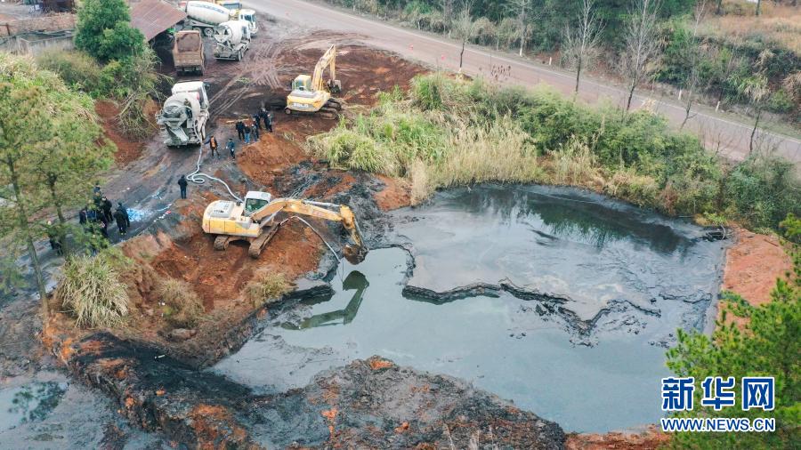 1月7日,在湖南省茶陵縣洣江街道諸睦村和建礦業(yè)有限公司,茶陵縣多部門工作人員在抓緊清理尾礦庫(kù)的廢水和淤泥(無(wú)人機(jī)照片)。 新華社發(fā)