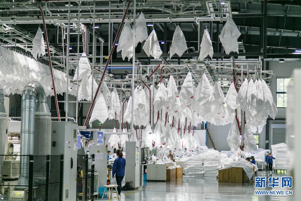 這是2019年4月28日在湖南省長沙市拍攝的夢潔家紡智能生產線。新華社記者 陳思汗 攝