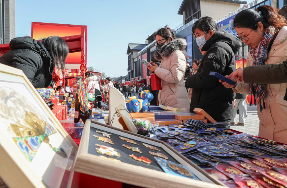 2026年2月4日,在“共享大市场·出口中国”2026年首场活动暨北京国际精品荟的进口商品推介区,参观者(左)购买展出的乌兹别克斯坦围巾。当日,“共享大市场·出口中国”2026年首场活动暨北京国际精品荟启动活动在湾里·王府井WellTown举行,现场打造了“一站式”全球好物采购展区,为市民新春消费注入活力。