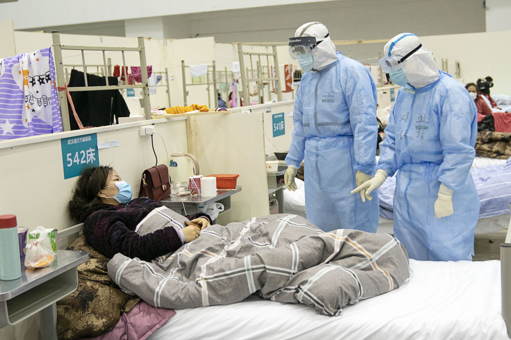 武漢客廳方艙醫(yī)院醫(yī)護(hù)人員在詢(xún)問(wèn)患者病情(新華社記者熊琦攝)
