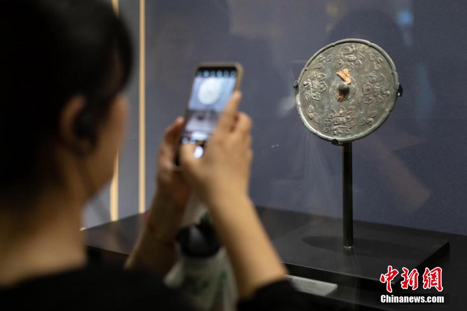 图为观众拍摄展出的唐代花鸟纹铜镜。 泱波 摄