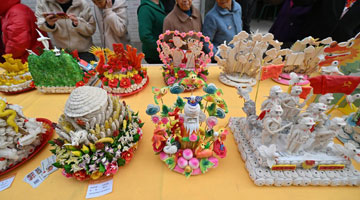 4月7日,在孟加拉国首都达卡,达卡大学的学生展示孟历新年庆祝活动所需的工艺品。